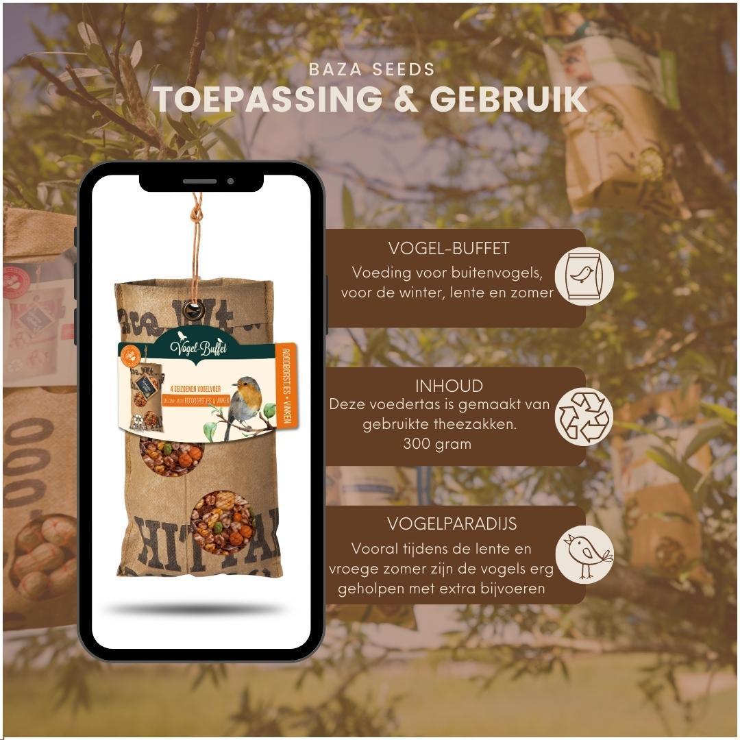De ECO-zak bevat 300 gram 4-seizoenenvoer dat rijk is aan energie, eiwitten, vitaminen en mineralen om roodborstjes & vinken in elk seizoen optimaal te voeden. Deze zorgvuldig samengestelde mix ondersteunt vogels tijdens het broeden en in de winter en draagt bij aan hun algehele vitaliteit en weerstand tegen ziekten.