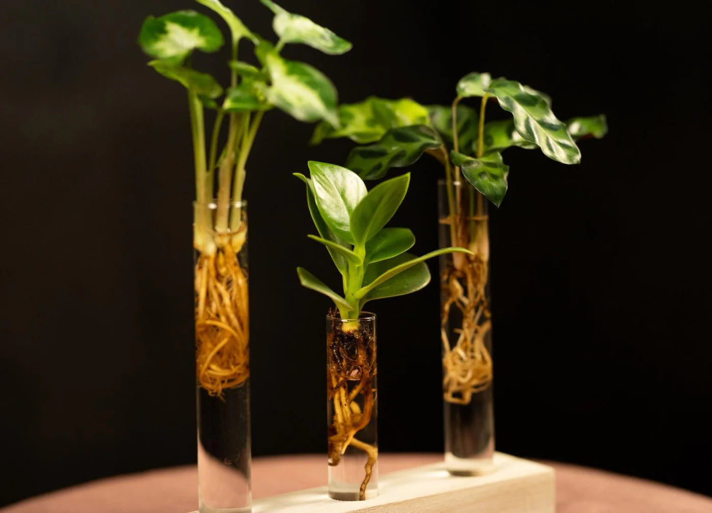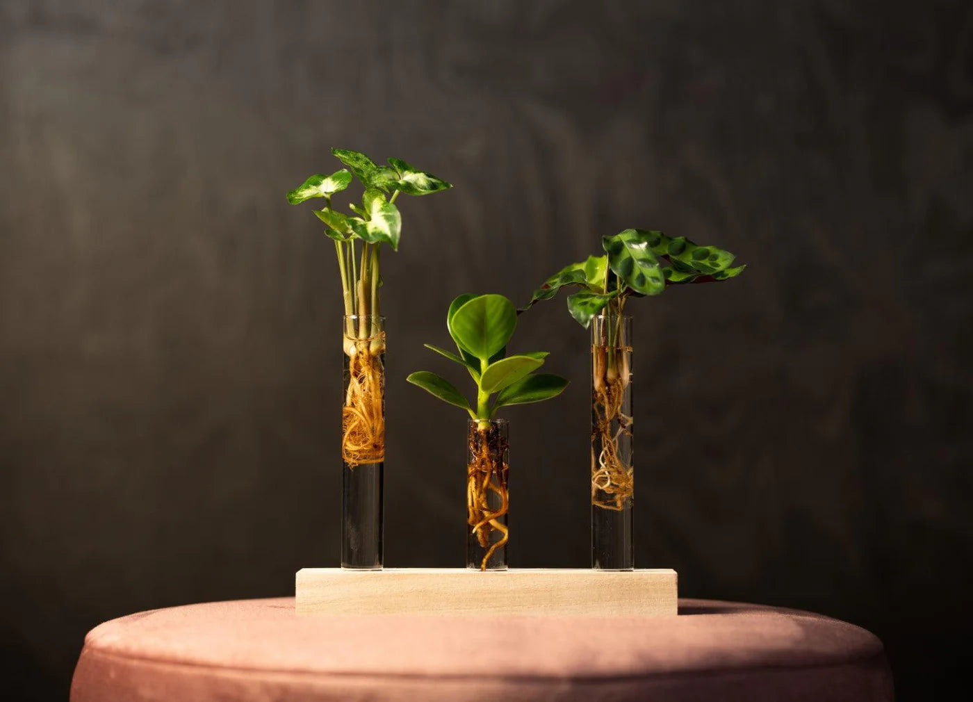5. Zet de drie buisjes in de bijgeleverde houten houder op een lichte plek in de woonkamer. Vul het water bij als het zakt.