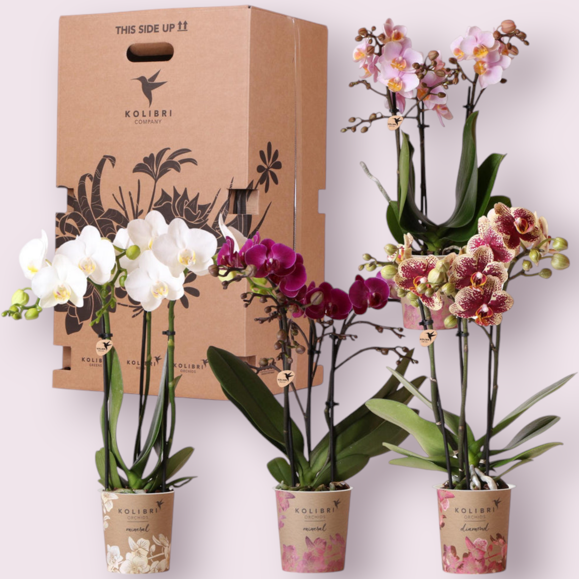 Je kunt kiezen uit een verrassingsbox mix kleur of een eénkleurige verrassingsbox (wij kiezen de kleur voor jou). Alle Kolibri Orchideeën worden zonder sierpot geleverd, zodat je ze kunt stylen zoals jij dat wilt.