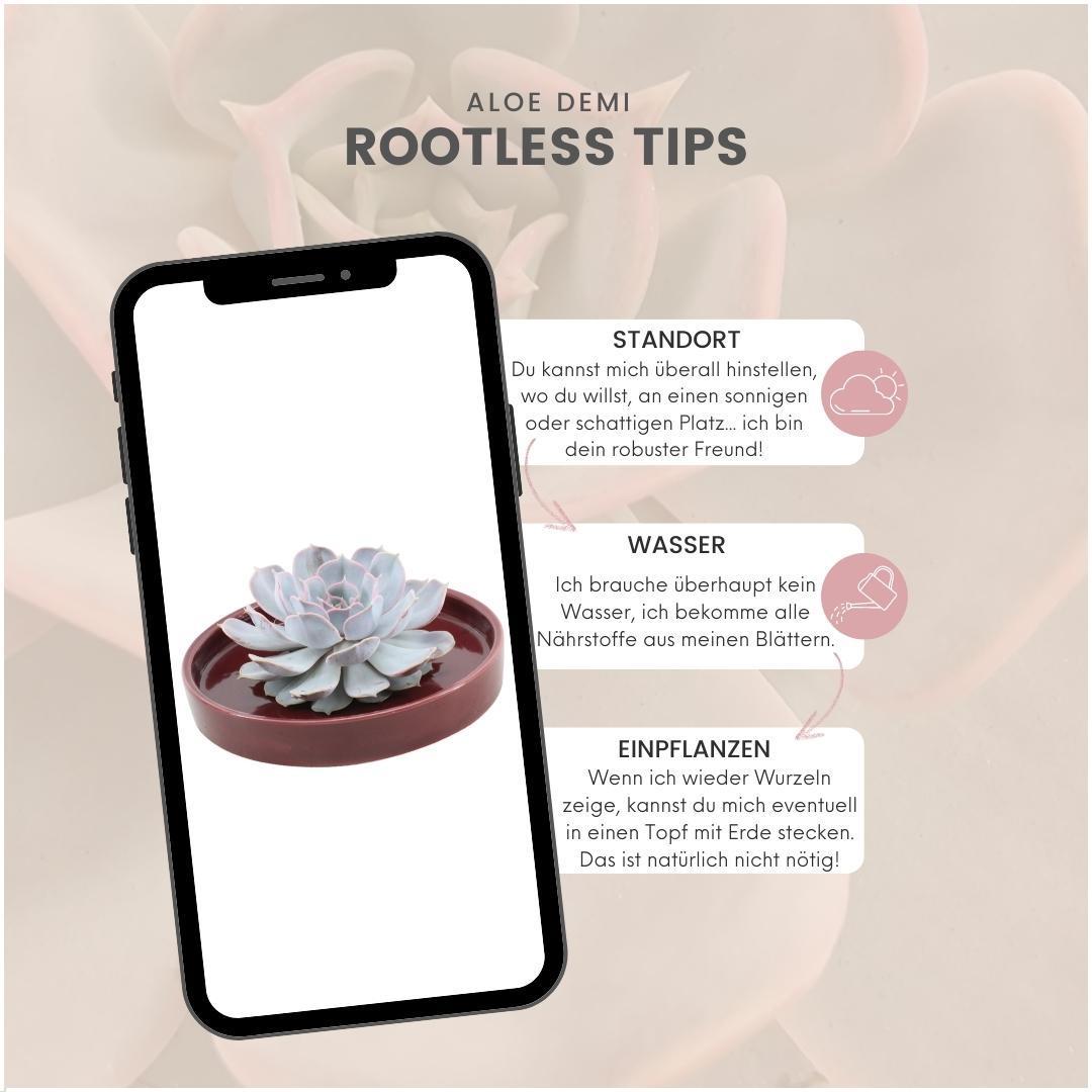 ROOTLESS succulents worden gekweekt in een kweekpot totdat ze de perfecte grootte hebben bereikt. Zodra het rozet groot genoeg is, wordt het voorzichtig van de potgrond losgesneden. Voorbeelden van ROOTLESS vetplanten zijn Echeveria, Aloe en Gasteria. Andere benamingen zijn snijvetplant, snijplant, snij-echeveria en snijsucculent.
