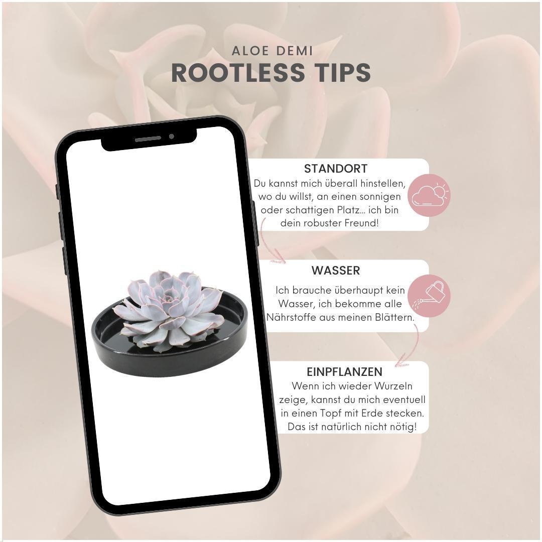 ROOTLESS succulents worden gekweekt in een pot tot ze de ideale grootte hebben bereikt. Wanneer het rozet groot genoeg is, wordt het voorzichtig van de potgrond losgesneden. Voorbeelden van ROOTLESS vetplanten zijn Echeveria, Aloe en Gasteria. Andere benamingen zijn snijvetplant, snijplant, snij-echeveria en snijsucculent.